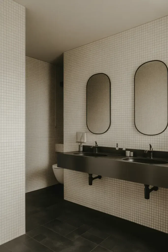 If you’re nervous about going too dark, this one’s for you. A mostly white bathroom with black accents feels fresh, airy, and timeless.