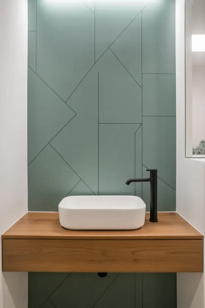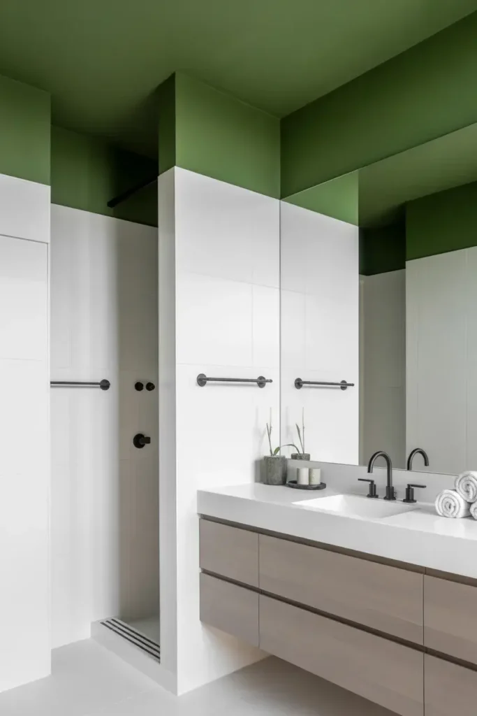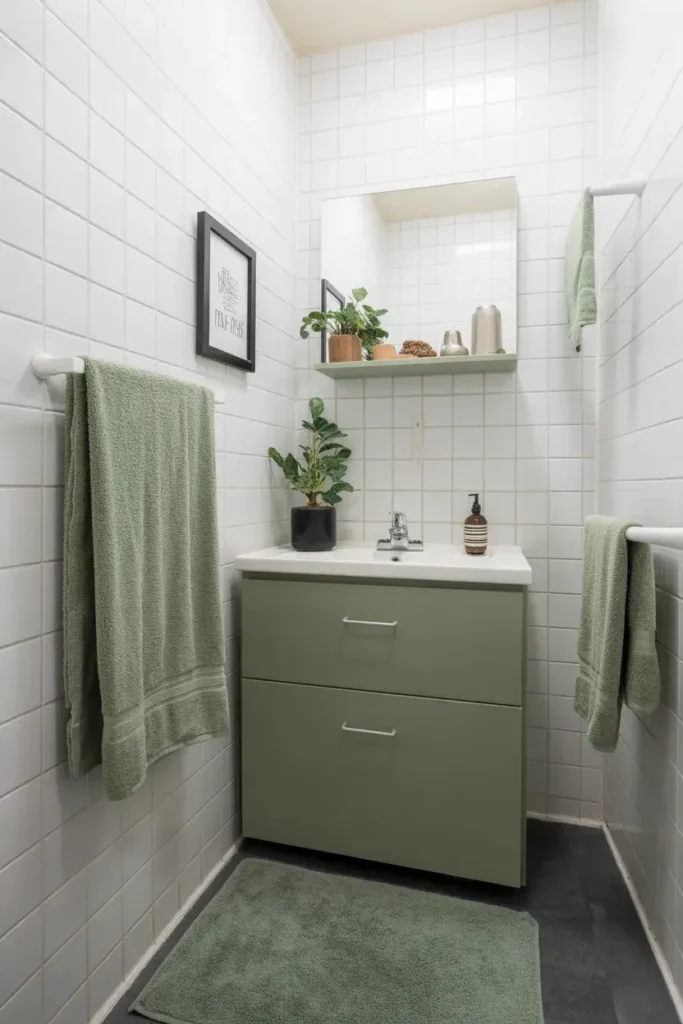 If you’re nervous about color, this combo is your safe zone. White keeps things bright, while sage adds warmth and personality. Together, they create a clean, airy vibe that works in any size bathroom.