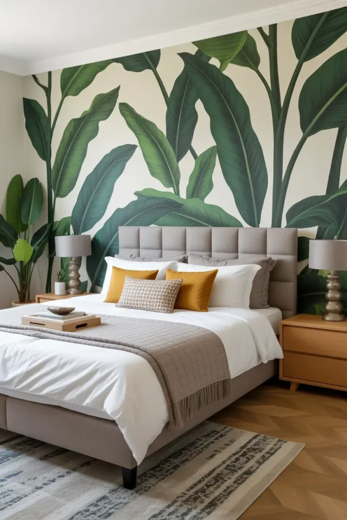 Big leafy prints instantly wake up a bedroom. Botanical wallpaper brings life, energy, and a bit of drama, especially behind the bed. It feels modern, natural, and Pinterest-approved.