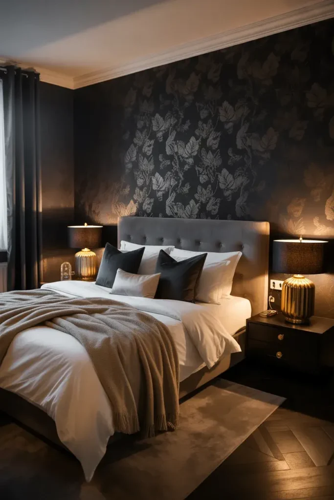 4. Moody Dark Wallpaper for a Luxurious Bedroom Vibe