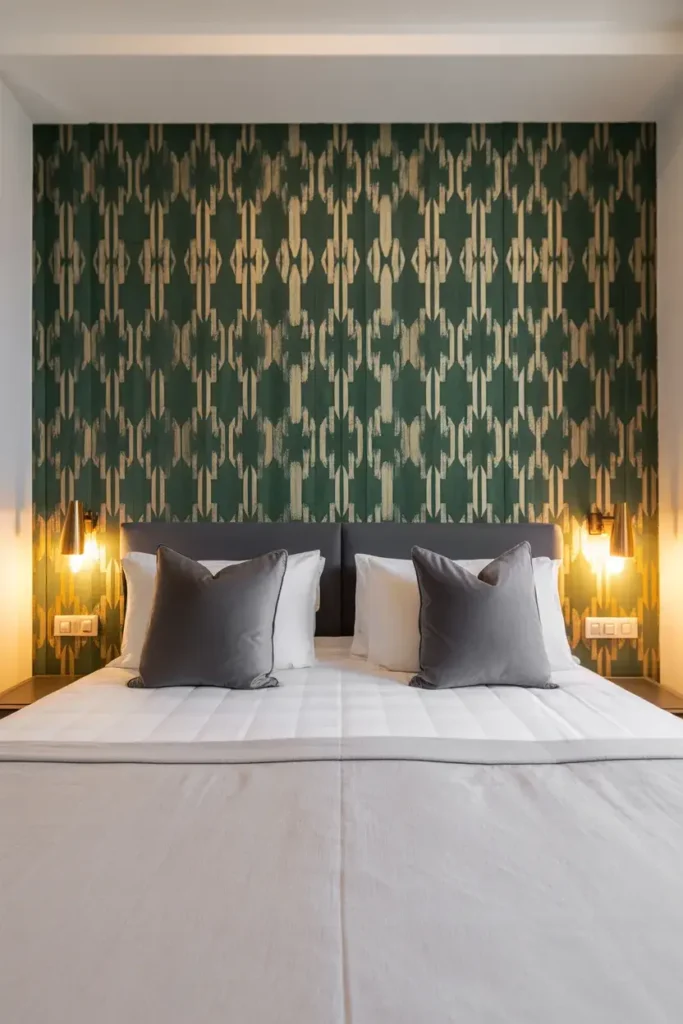 Geometric wallpaper adds energy and structure to a space. From soft repeating shapes to bold patterns, it works beautifully in modern bedrooms. It’s playful without being chaotic.