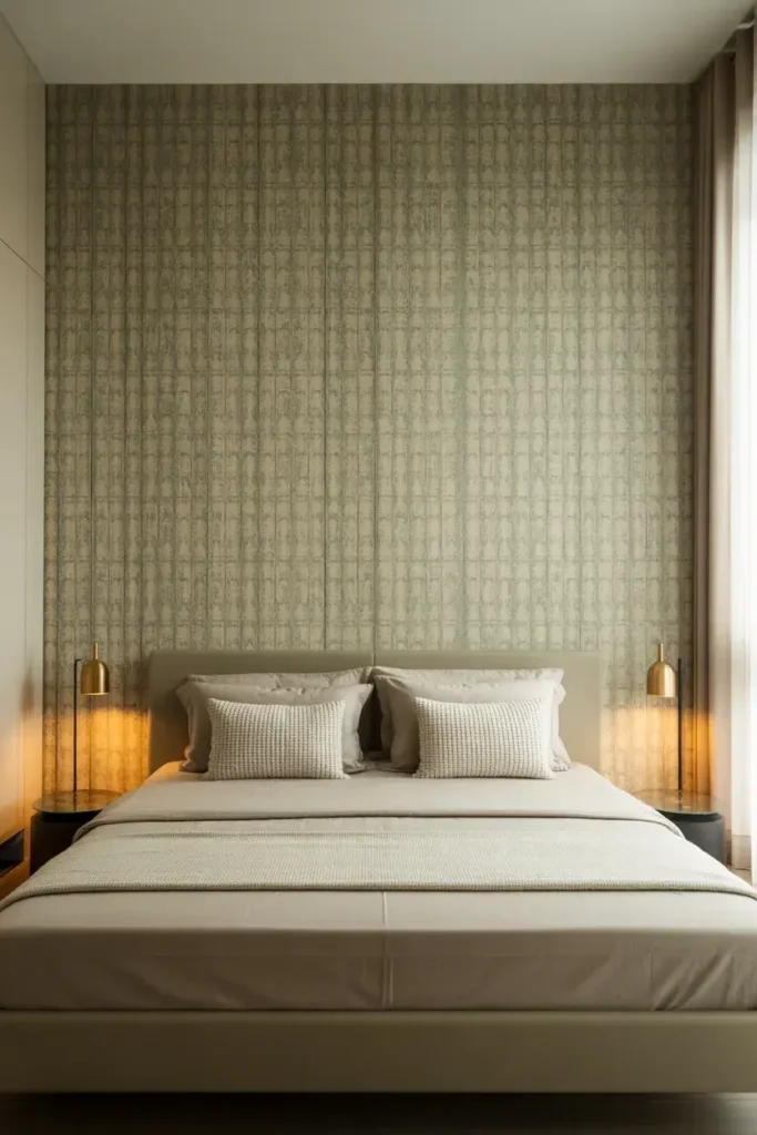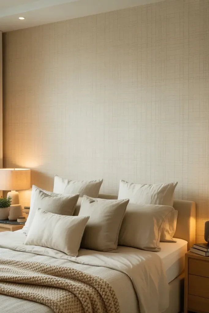 If bold patterns scare you a little, neutral wallpaper is your best friend. Beige, cream, soft gray, or linen-style textures add depth without overwhelming the room. It feels peaceful and grown-up.