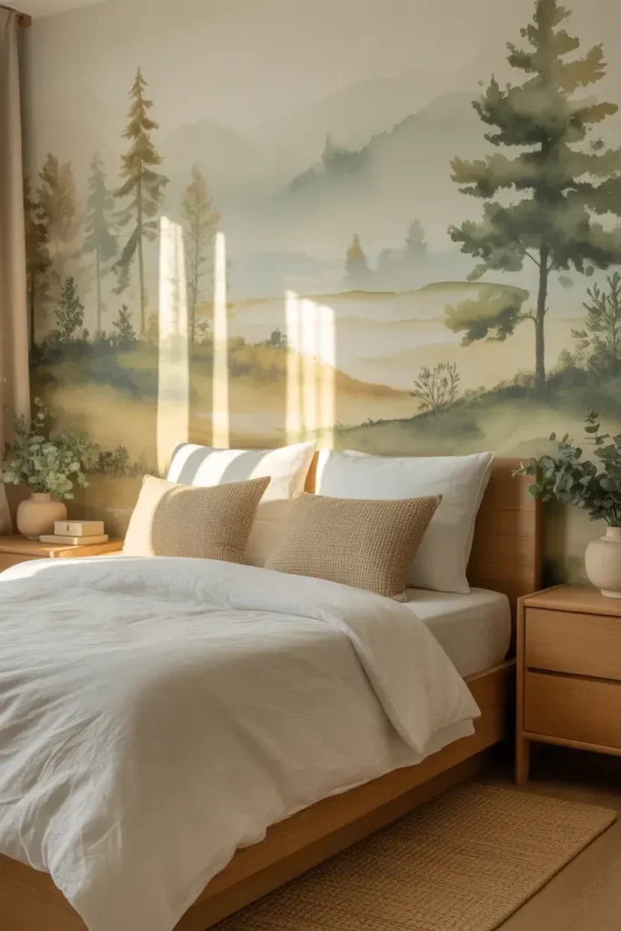 Nature-themed wallpaper creates instant calm. Mountains, trees, clouds, or soft landscapes turn your bedroom into a mini escape. It feels peaceful and grounding.