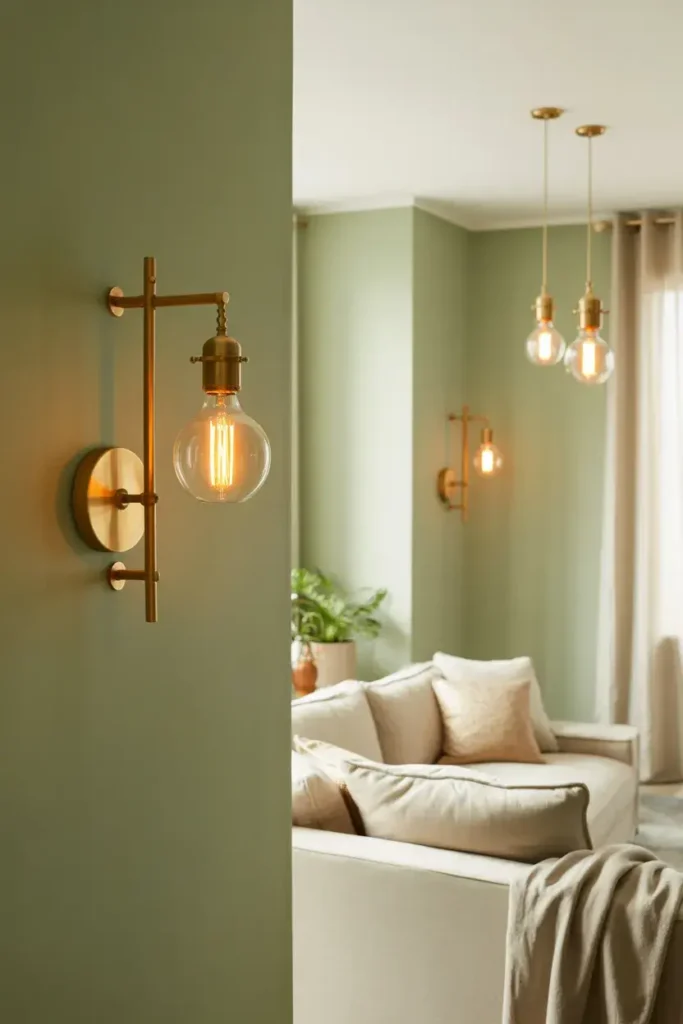 2. Sage Green Walls with Brushed Gold Lighting