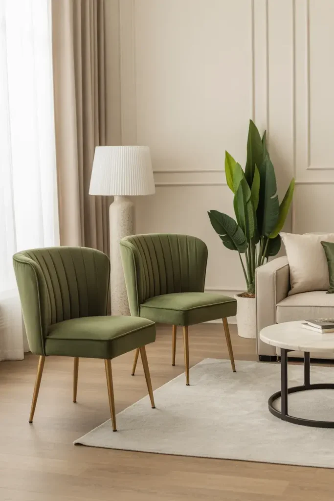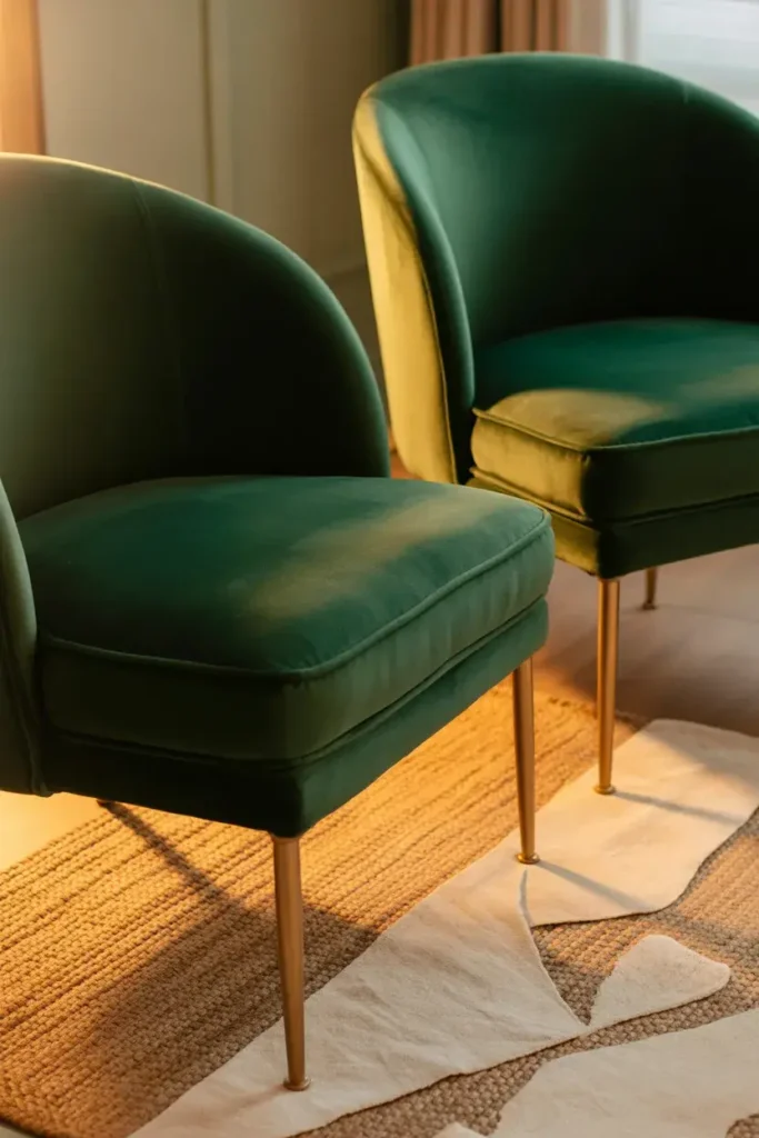A pair of green velvet accent chairs with slim gold legs feels designer-approved but still cozy.