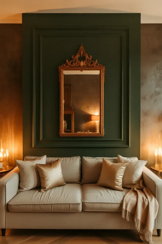 4. Dark Green Accent Wall with Gold Mirror
