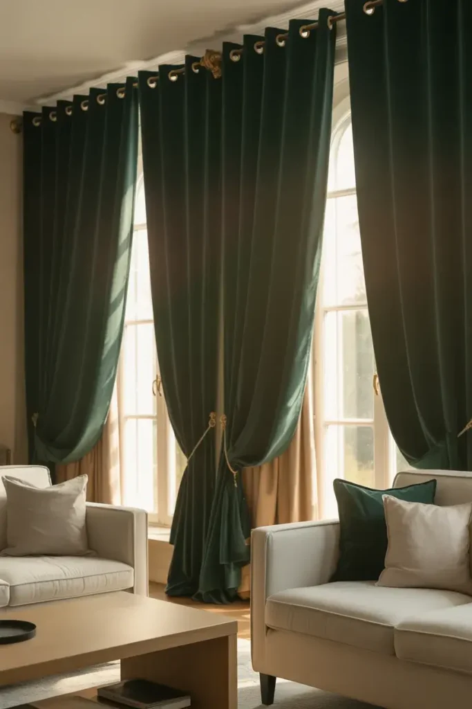 Curtains are underrated. Rich green curtains instantly frame the room.