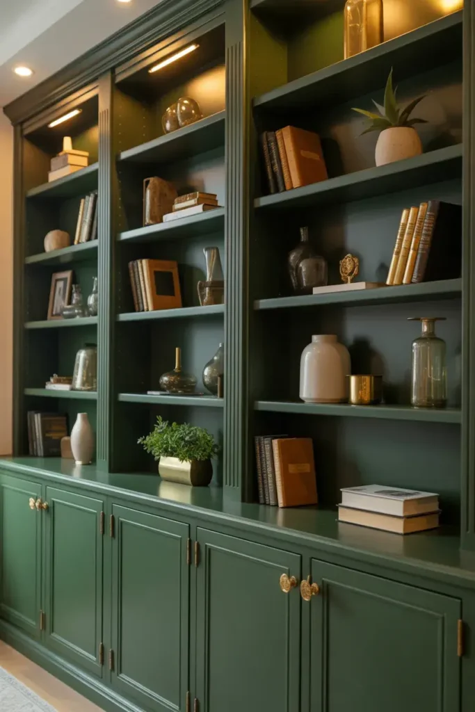 Built-ins painted forest green look custom and elevated.