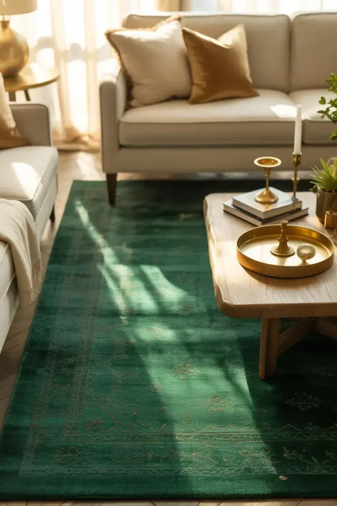 If walls and furniture are neutral, a green rug can anchor the room beautifully.