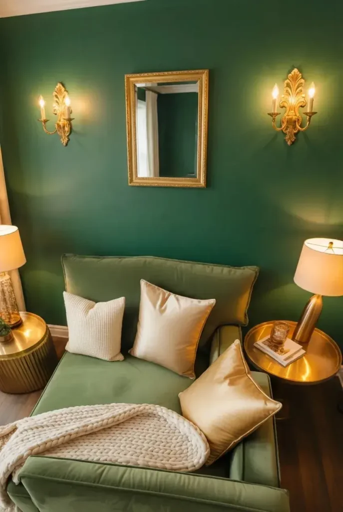 If you love dramatic spaces, deep green walls paired with layered gold lighting create a serious atmosphere. The gold fixtures glow beautifully against darker tones, especially in the evening.