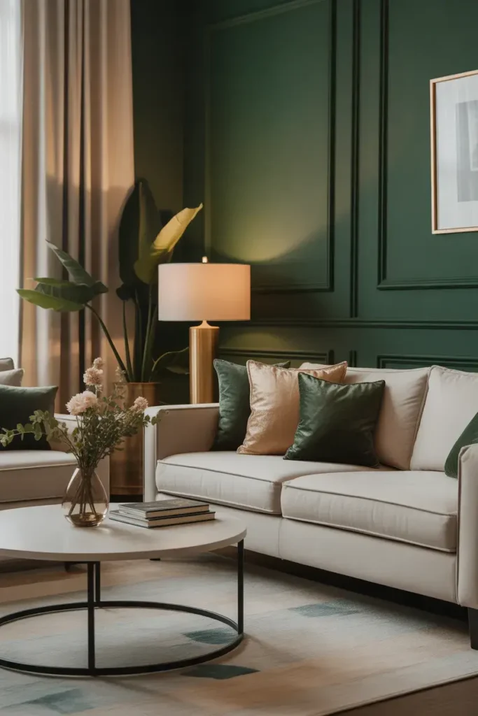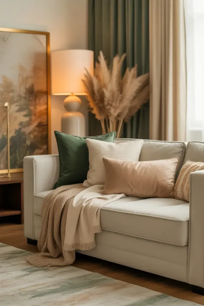 Layering cream and beige tones prevents green and gold from feeling overwhelming.