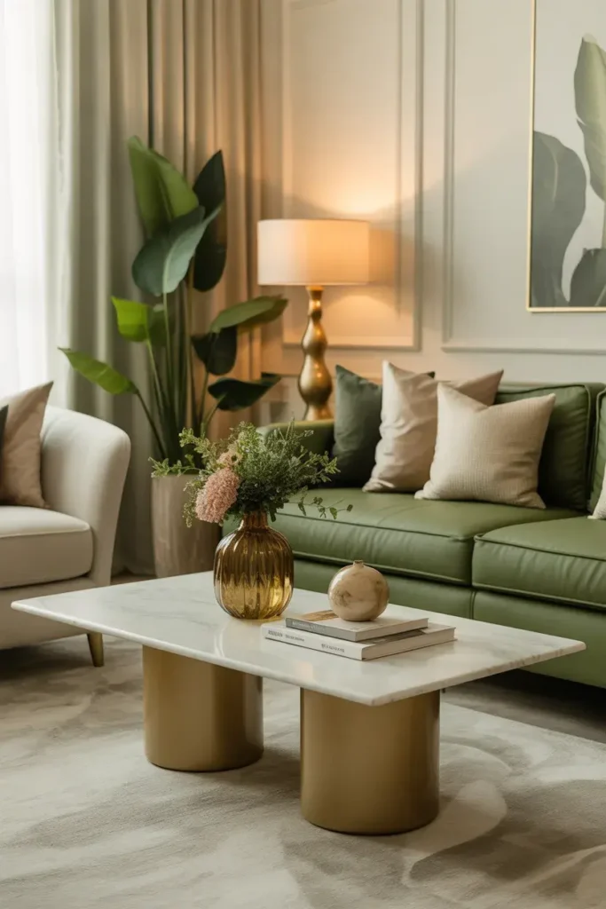 Marble instantly elevates green and gold without adding heaviness. A marble coffee table, side table, or even decorative tray softens the richness of green while letting gold details shine.