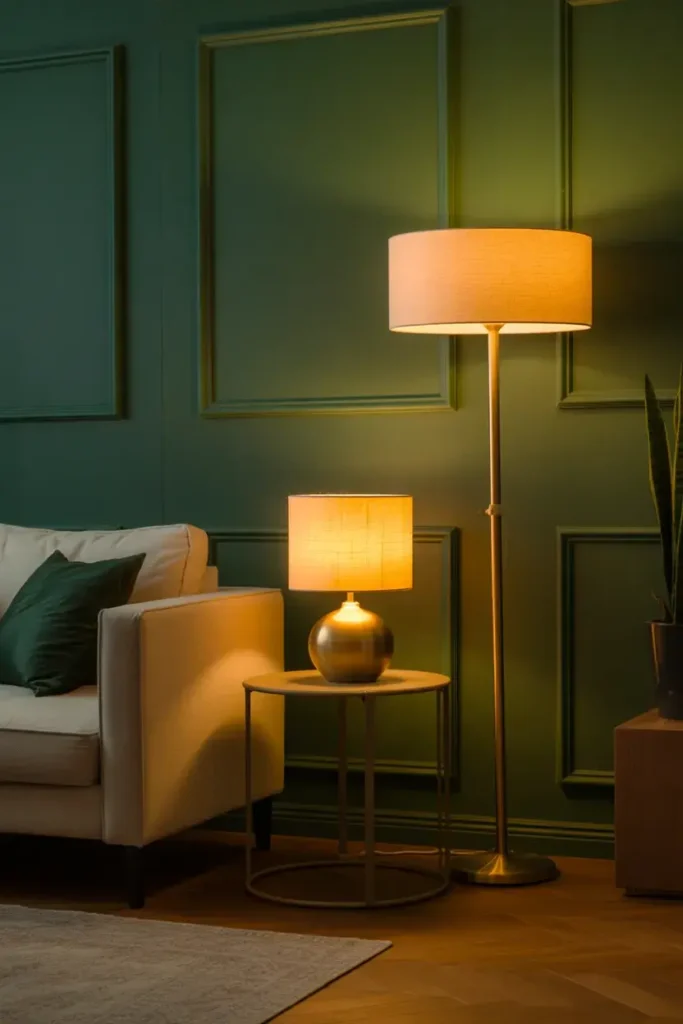 - Mix a gold floor lamp + table lamp for depth