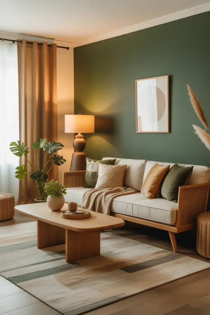 A deep green accent wall adds depth without overwhelming the whole room.