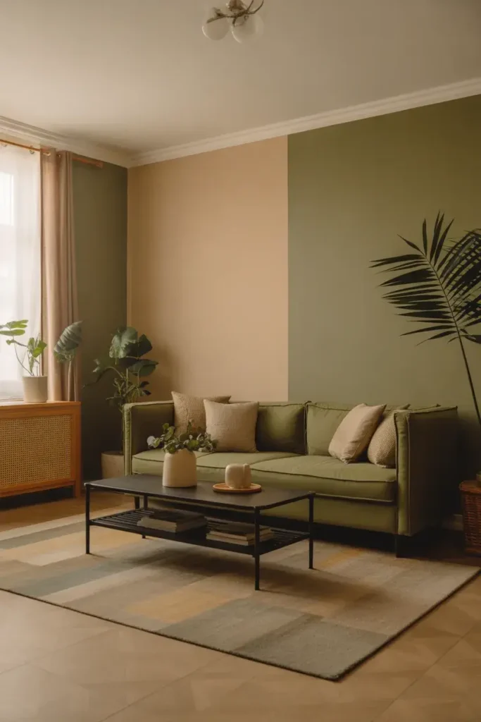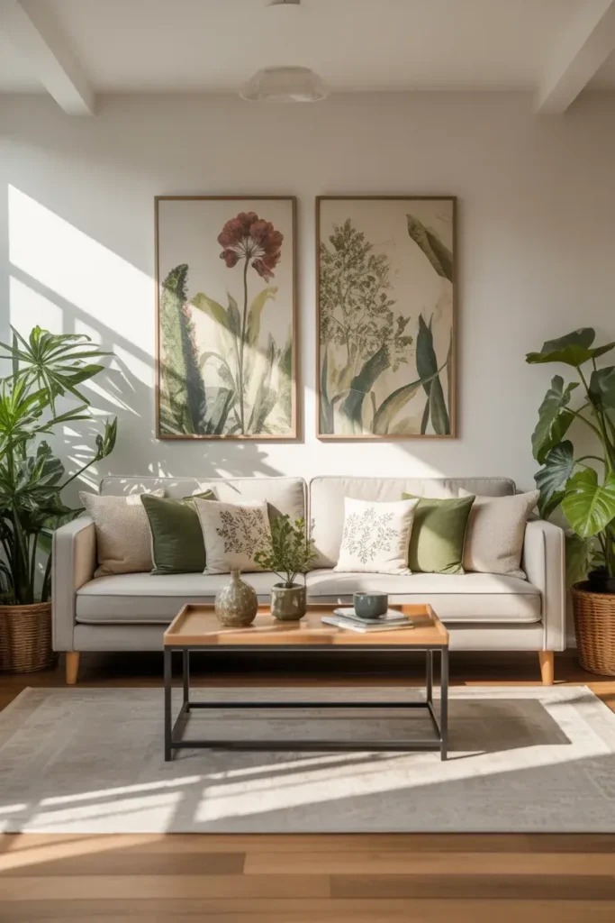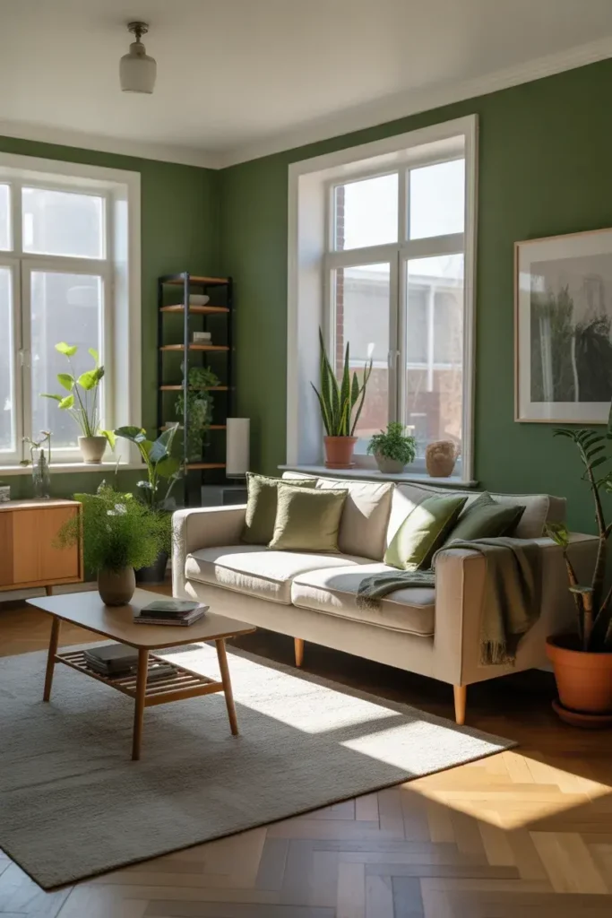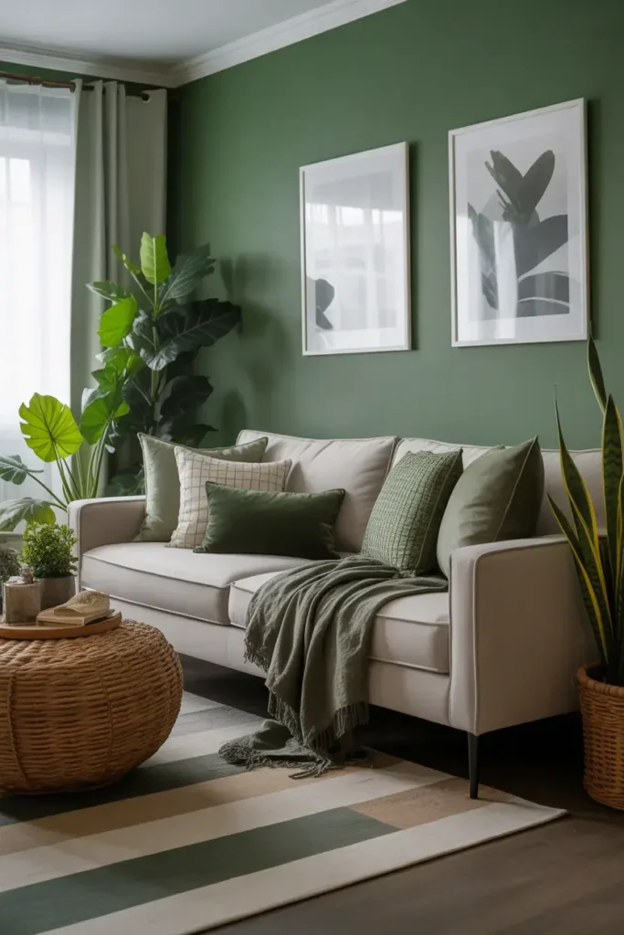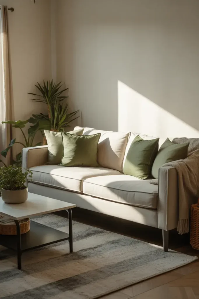 Neutral furniture helps green decor stand out without overwhelming the space.