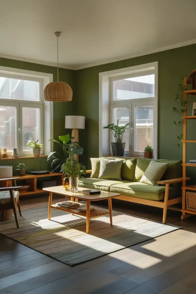 8. Green Living Room with Natural Wood Furniture