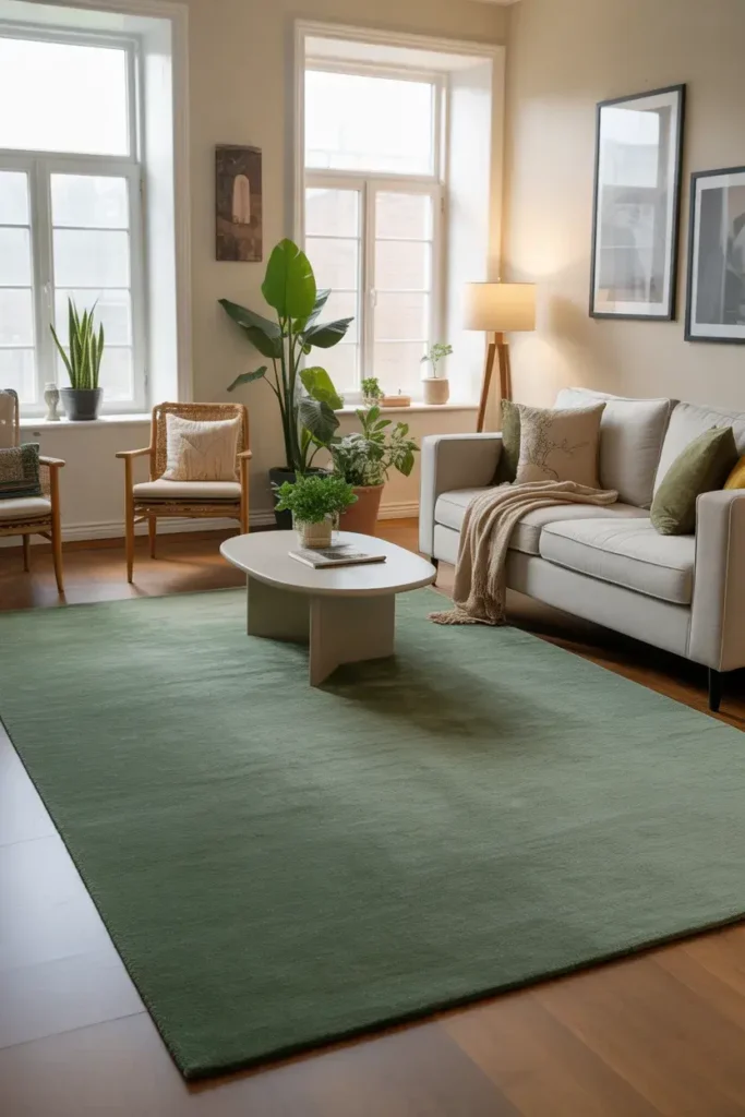 A green rug can anchor the room and tie together other decor elements.