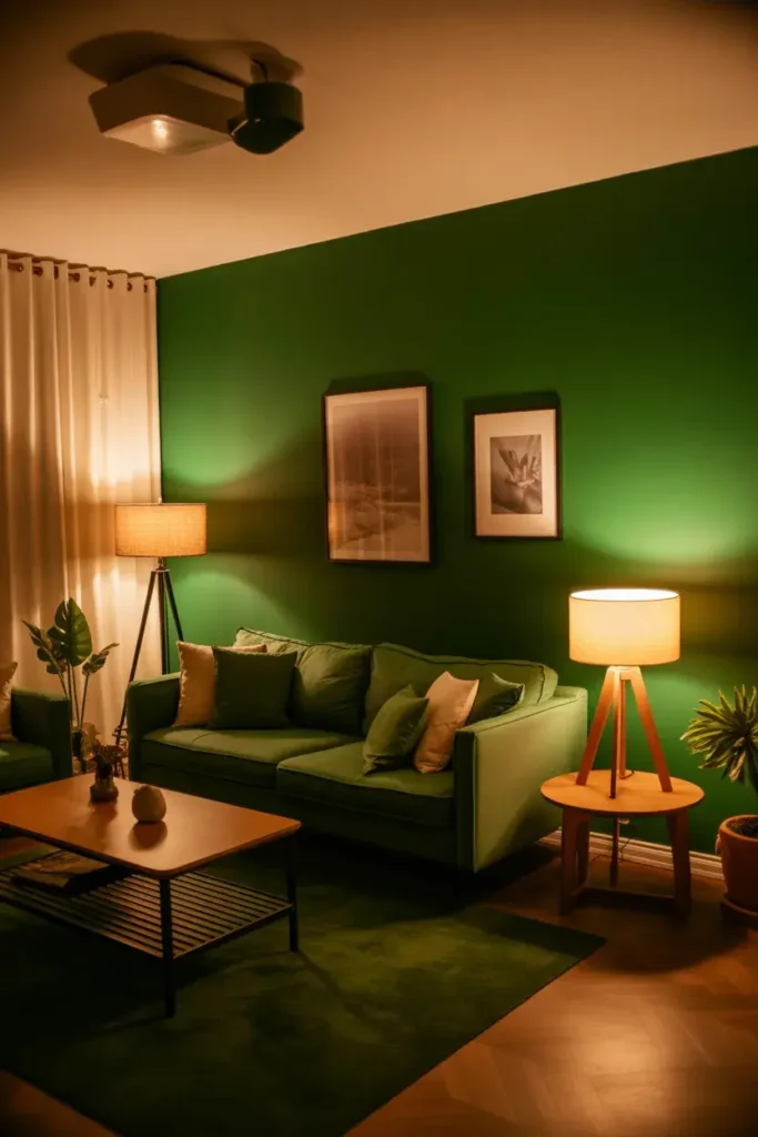 15. Green Living Room with Cozy Lighting