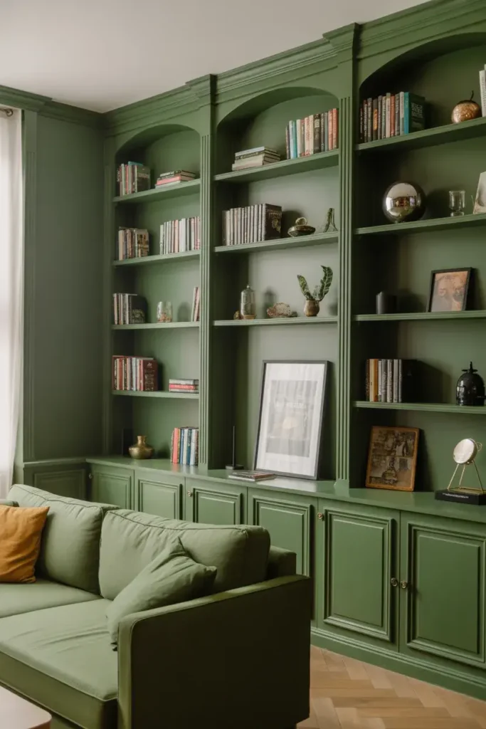 Whether you choose sage, olive, or deep emerald, the color becomes a beautiful focal point that anchors the room.