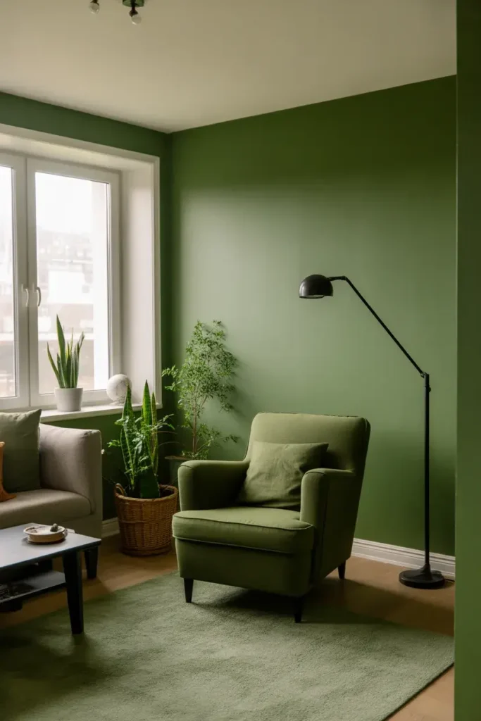 19. Green Living Room with Cozy Reading Corner