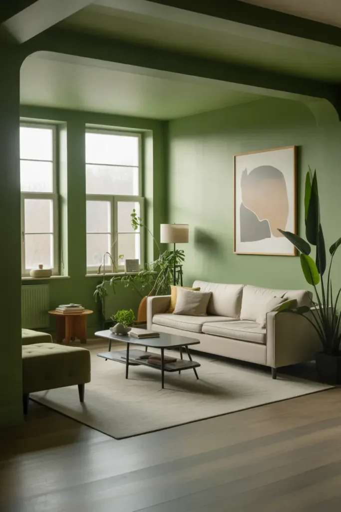 17. Green Living Room with Neutral Furniture