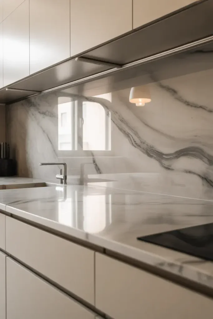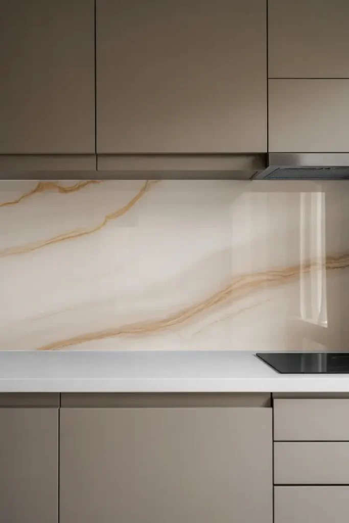Instead of busy grout lines, you get one continuous surface that looks calm and intentional. It works especially well with stone or quartz countertops.