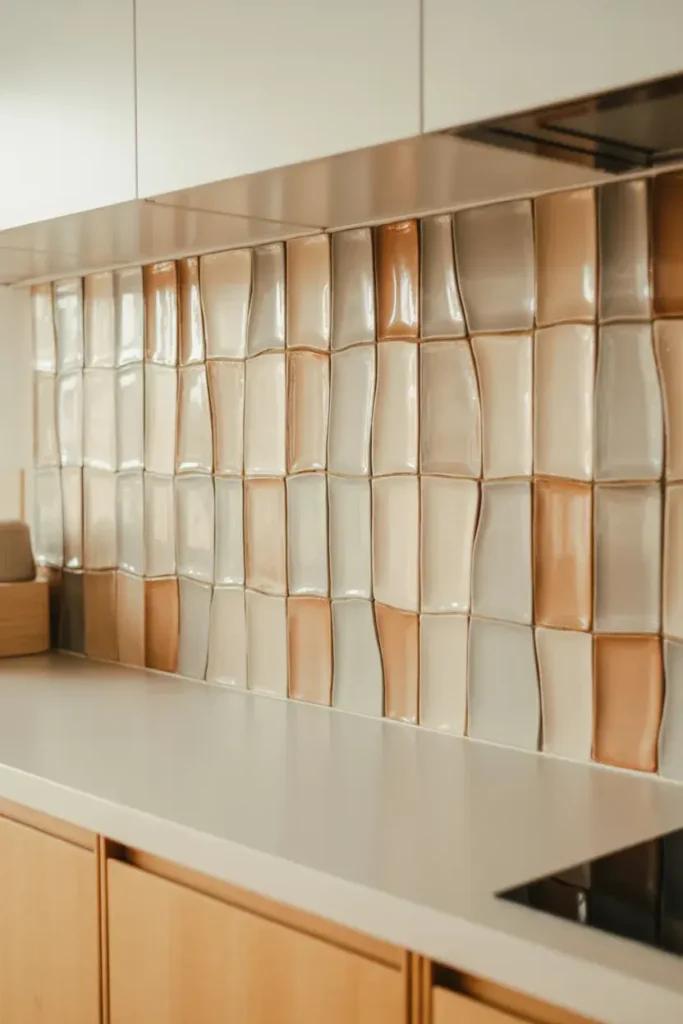 It catches light gently and adds warmth to modern kitchens. Subtle texture is the key here.