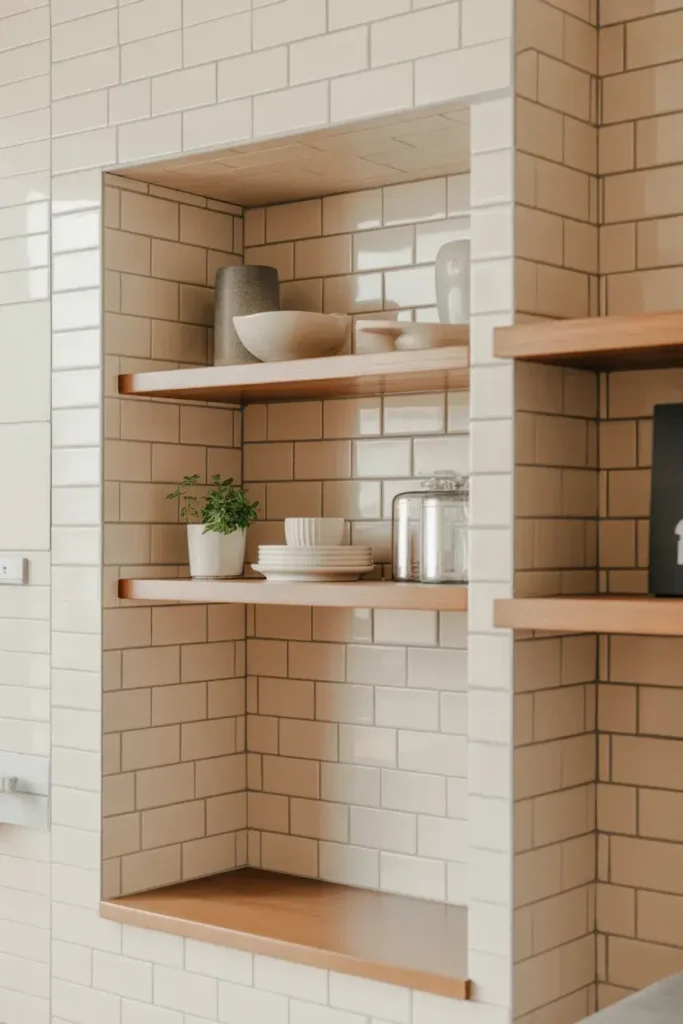 Combining open shelving with backsplash tile creates a layered, intentional look. It breaks up large wall areas nicely.