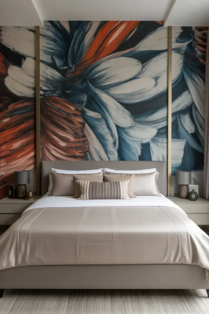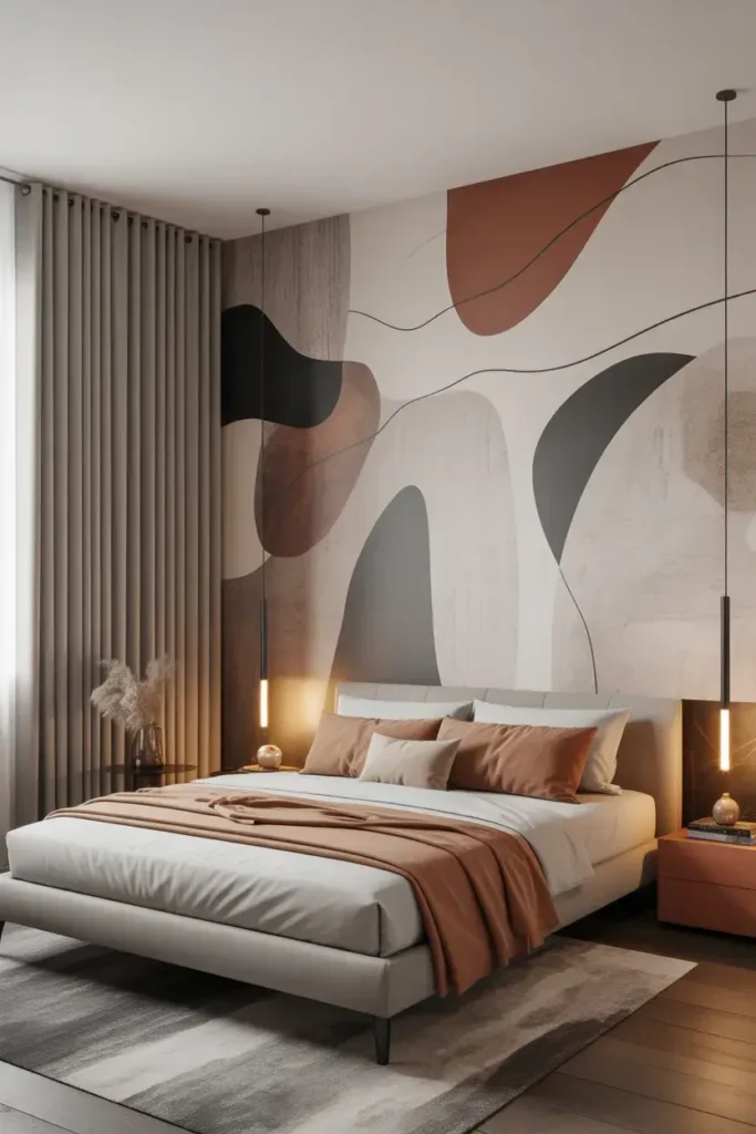 On one wall, abstract designs feel modern and fresh. Great for contemporary bedrooms.