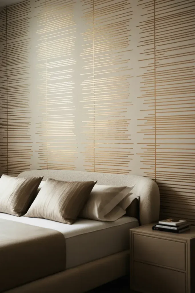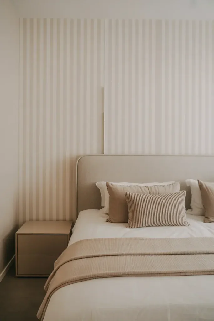 In a one wall wallpaper bedroom, stripes add structure without stealing the show. FYI, neutral stripes are easiest to style.