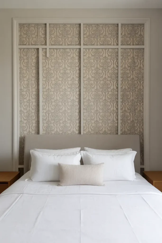 Instead of covering the whole wall, frame wallpaper behind the bed like artwork. It’s elegant and unique.