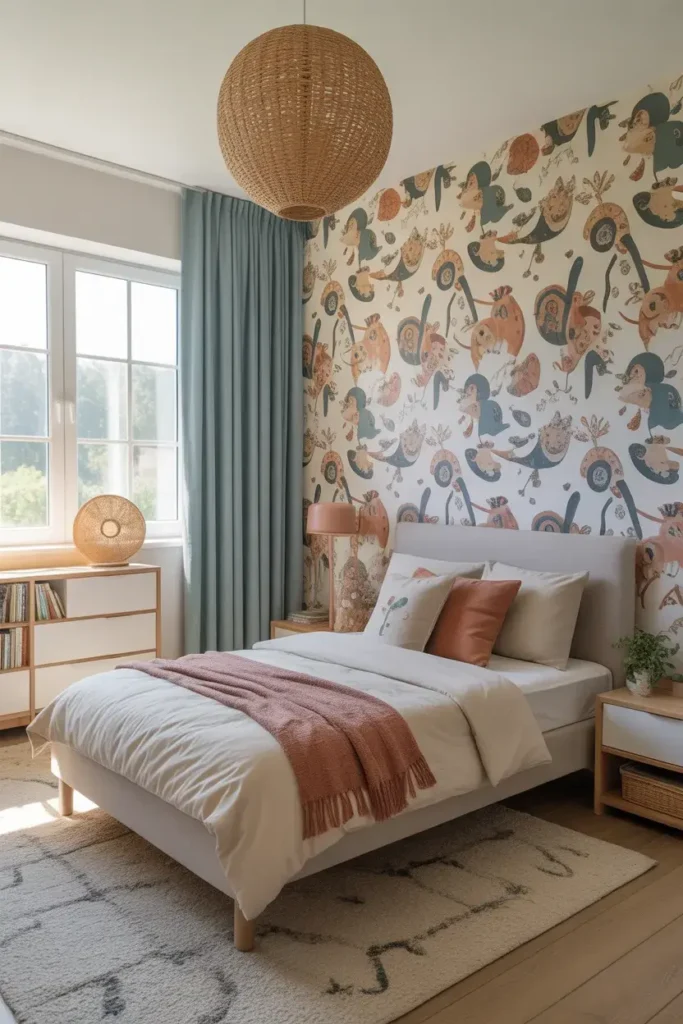One wall wallpaper works wonders in kids’ rooms too. It adds fun without overstimulating the space.