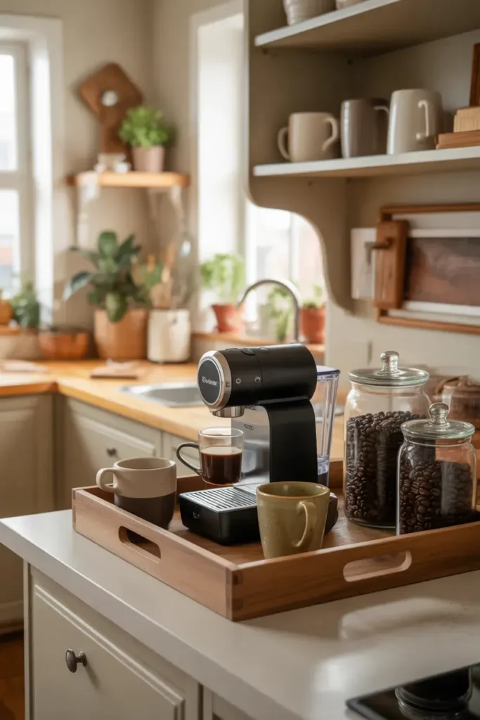 A simple tray can instantly turn your countertop into a mini coffee bar. It keeps everything organized while still looking stylish.