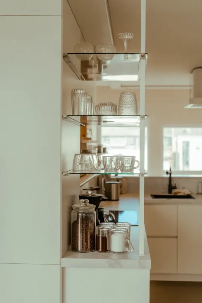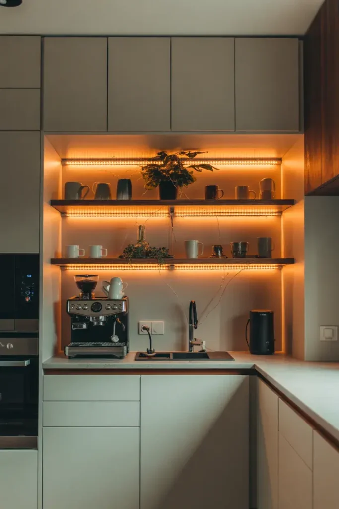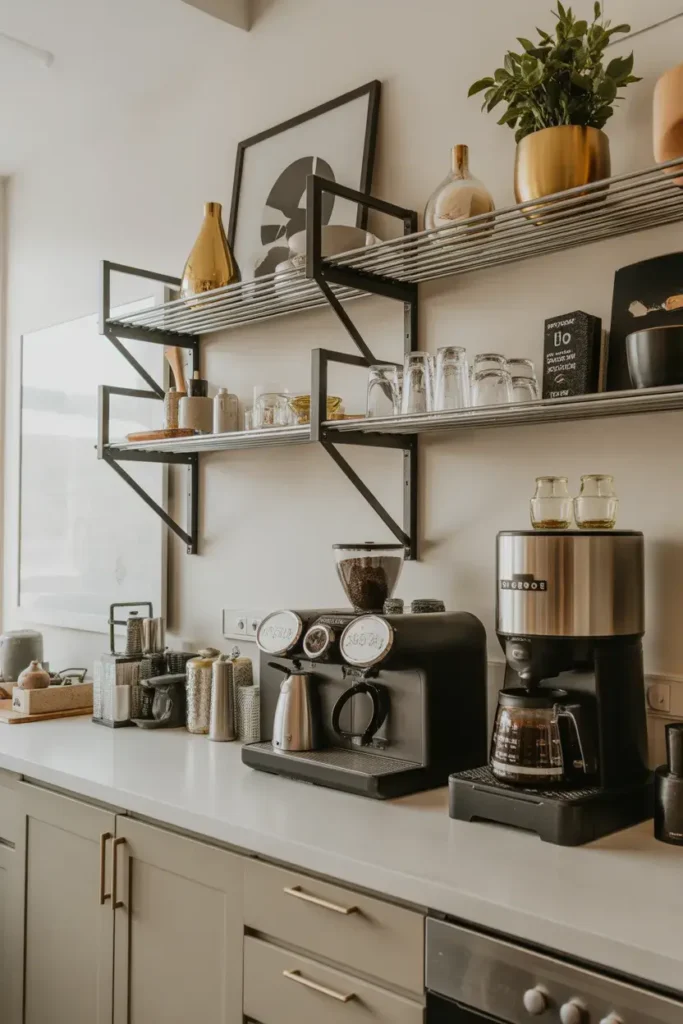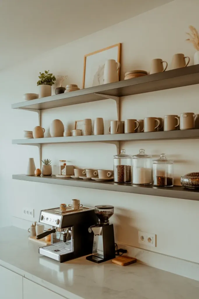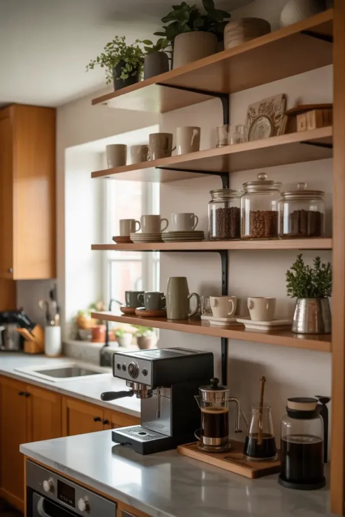 Floating shelves help you use vertical space. They also create a clean and modern coffee bar look.