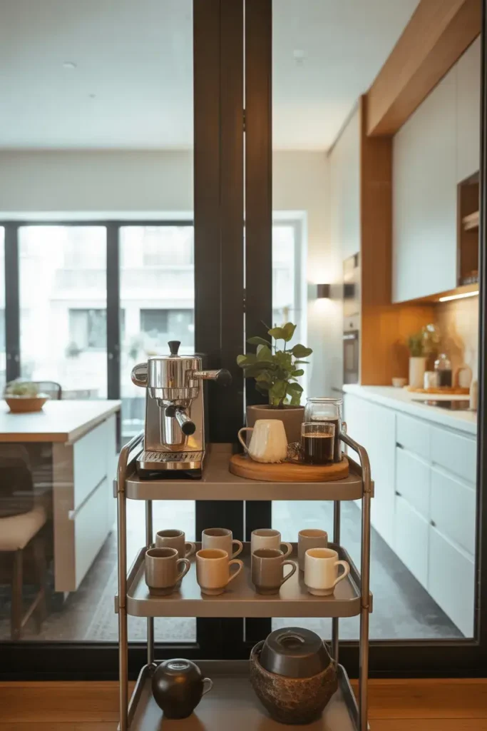 A bar cart can easily transform into a movable coffee station. It’s perfect for small kitchens or apartments.