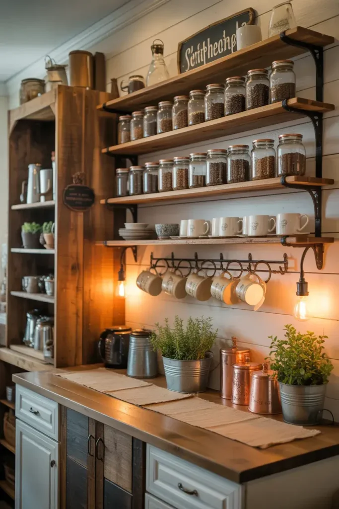 Wood textures instantly add warmth. A rustic coffee bar feels cozy and inviting.