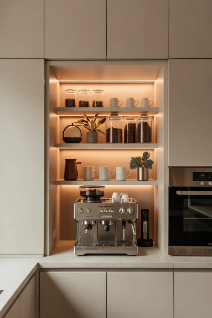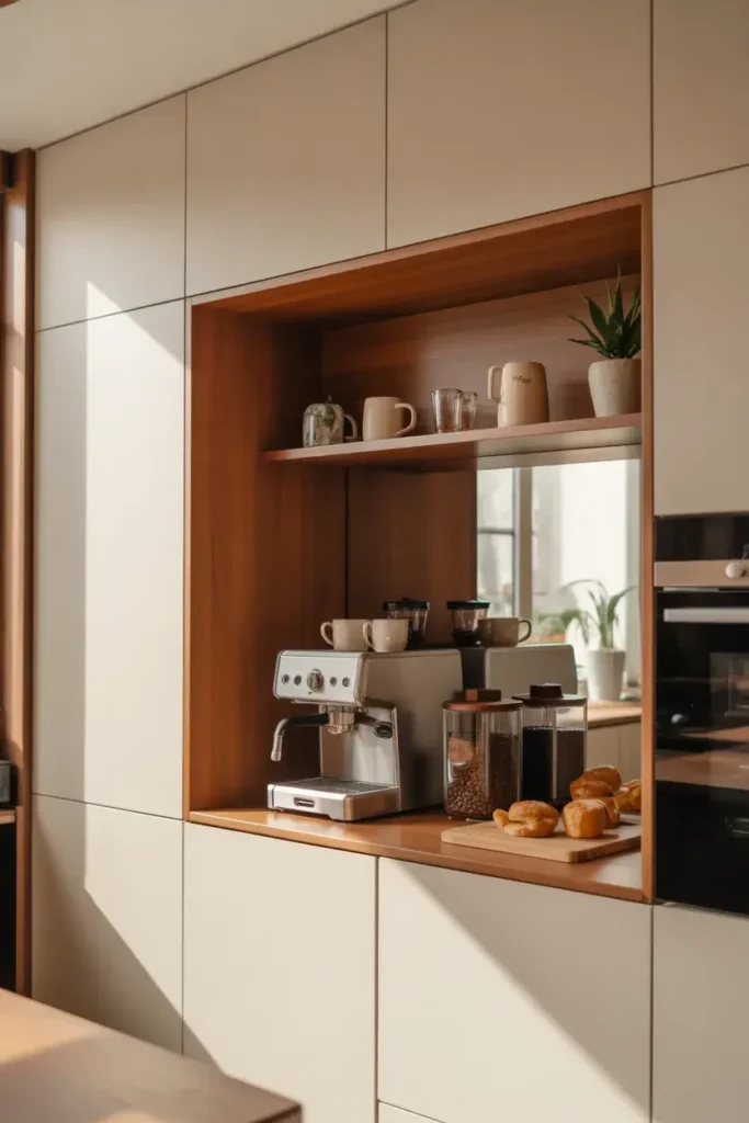 A niche creates a dedicated coffee space.It looks custom and well-designed.