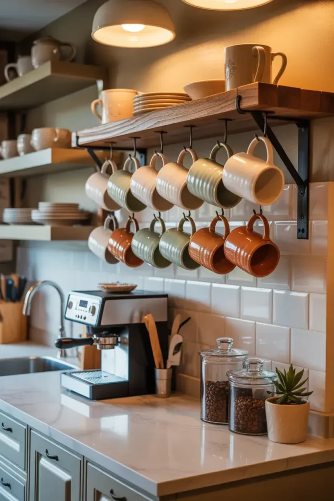 Hanging mugs save space and look super cute. They also make your coffee bar feel more decorative.