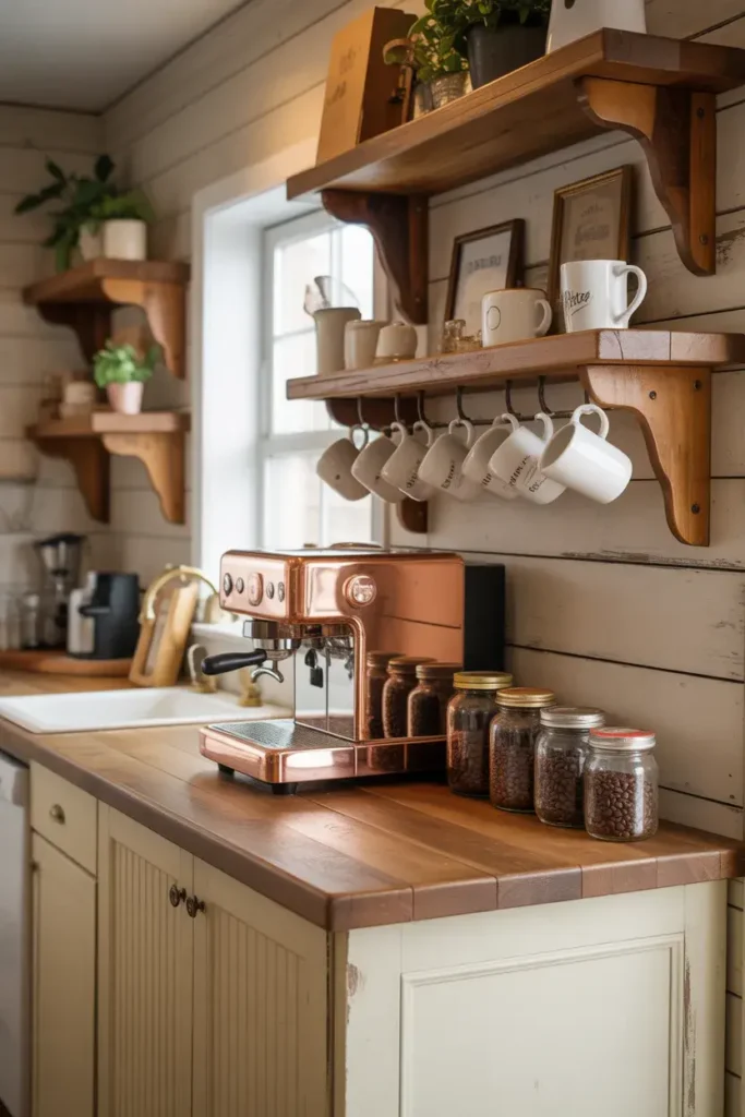 Unused kitchen corners are perfect for a cozy coffee station. Even a small area can feel special with the right setup.