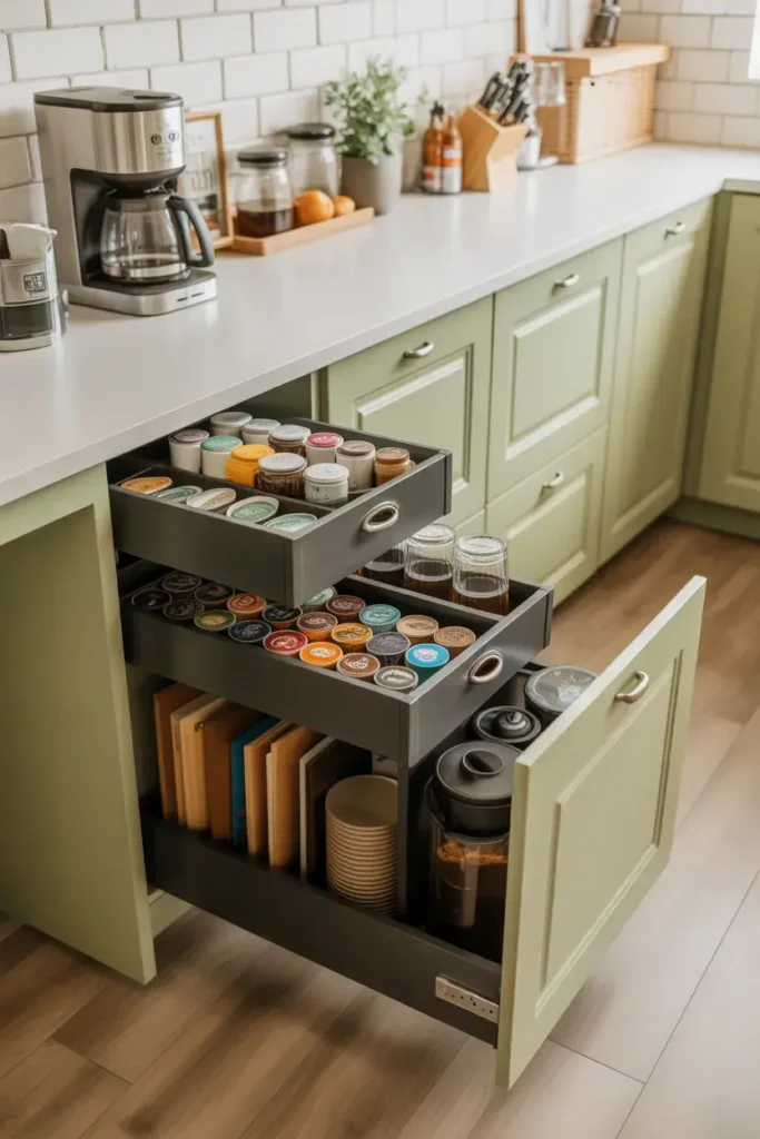 Drawers help keep everything organized. They’re perfect for storing pods, spoons, and extras.