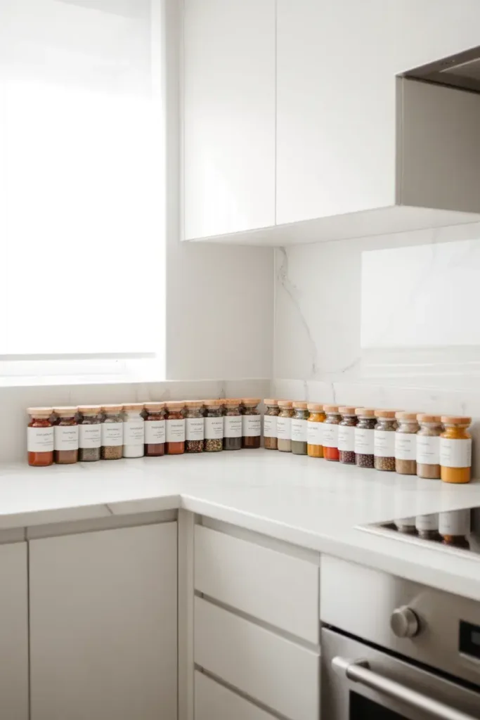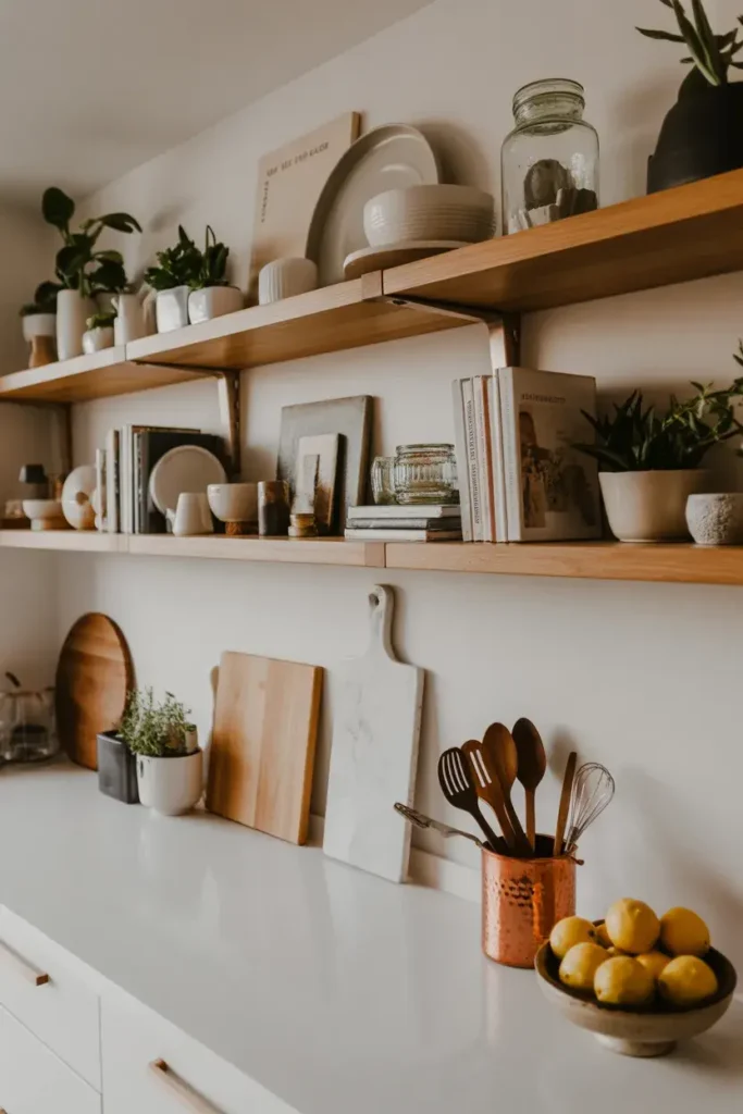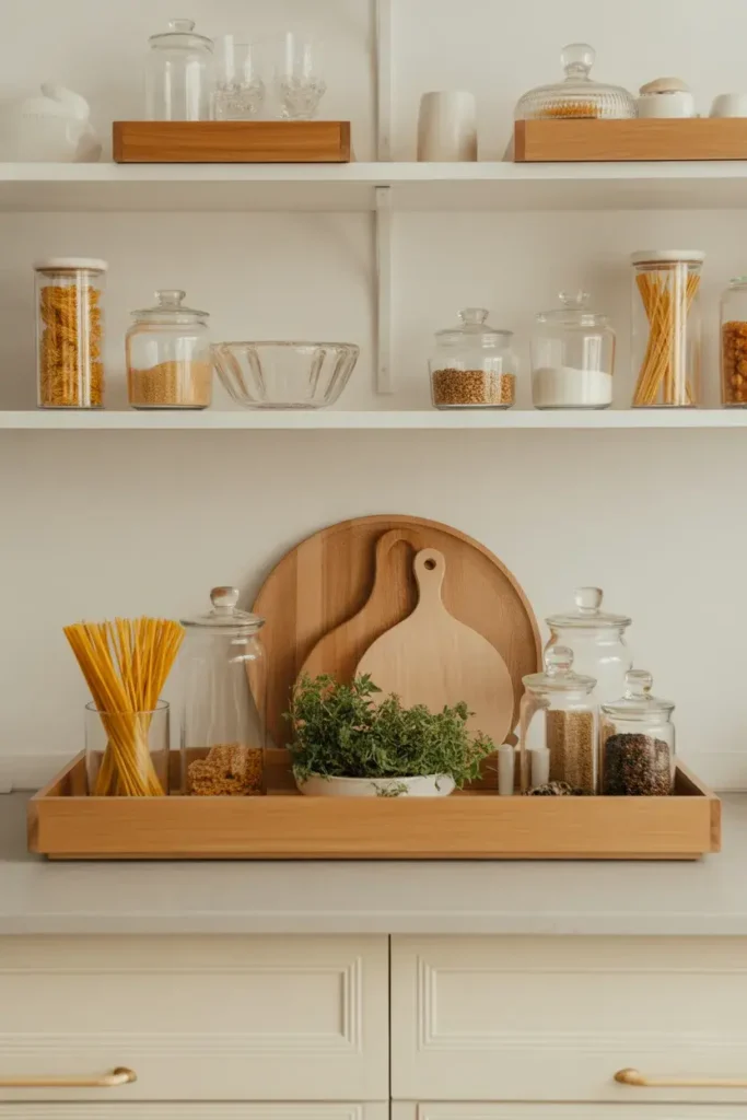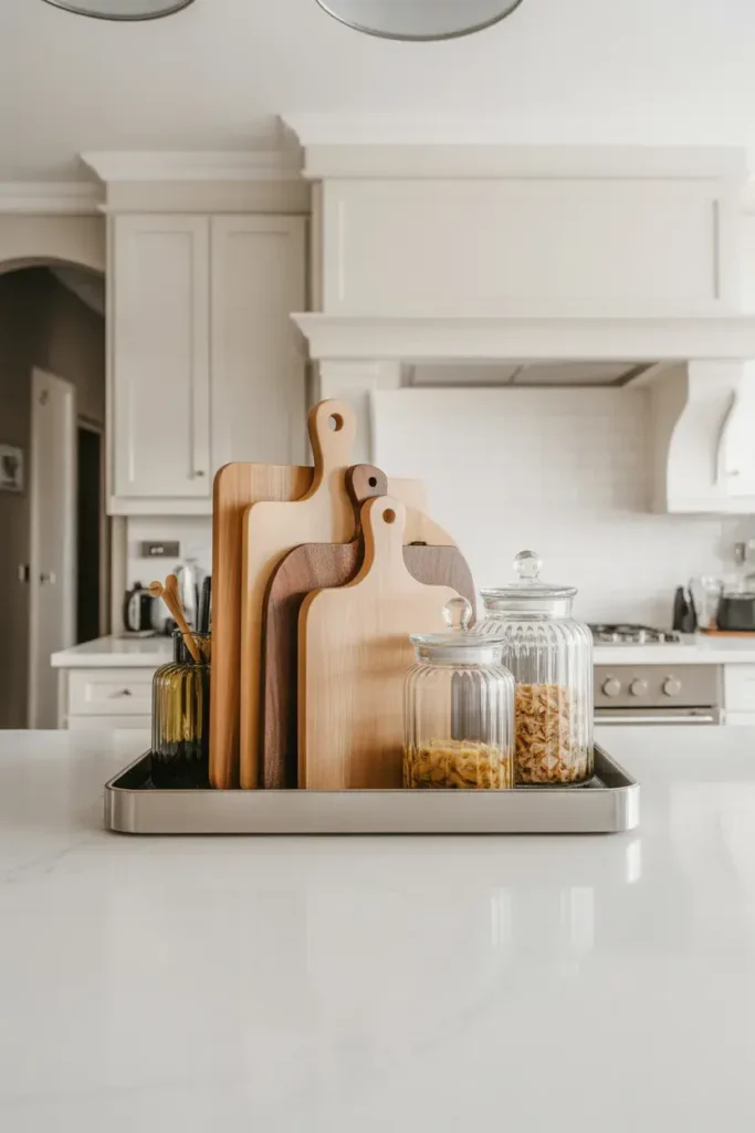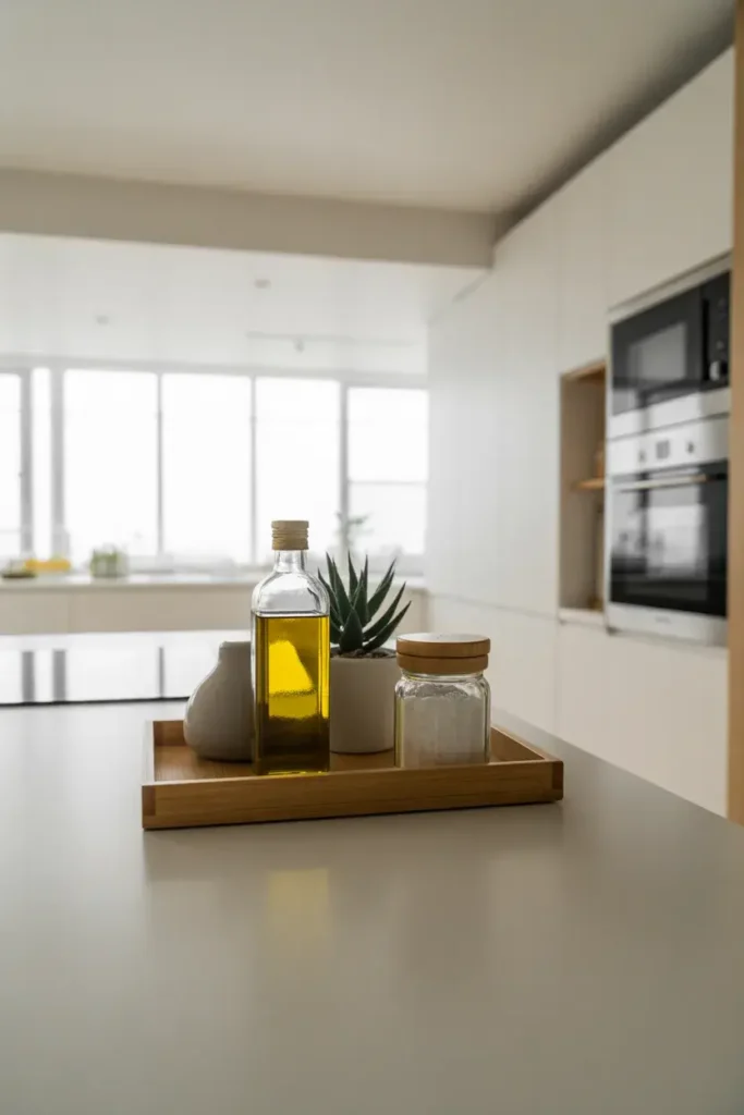 Picture a small wooden or marble tray near your stove holding olive oil, a salt jar, and maybe a tiny plant. It feels organized but still lived-in.