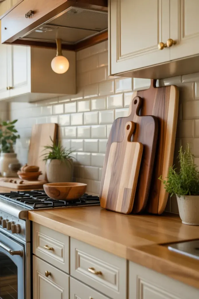 Here’s the thing—cutting boards don’t need to be hidden away. Lean a couple of wooden boards against the backsplash, and suddenly your kitchen feels warmer.