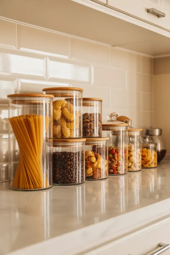 Glass jars turn everyday items into decor. Place them along the counter, and it feels both organized and styled.