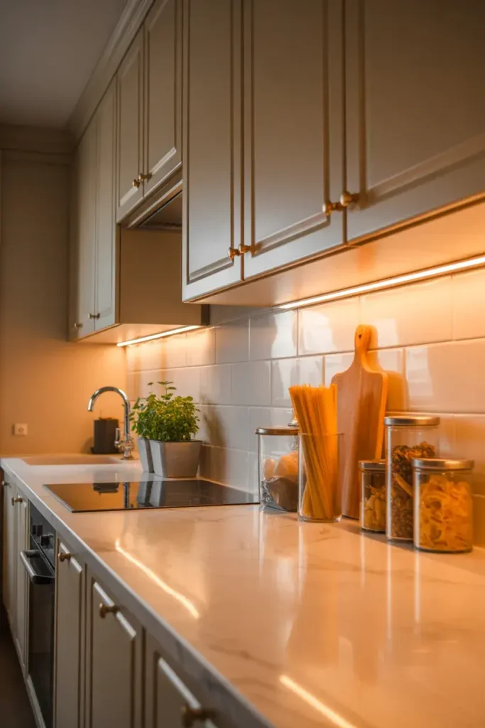 Adding soft lighting under cabinets highlights your counter decor and creates a cozy glow.