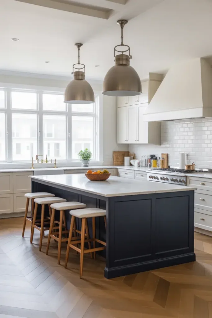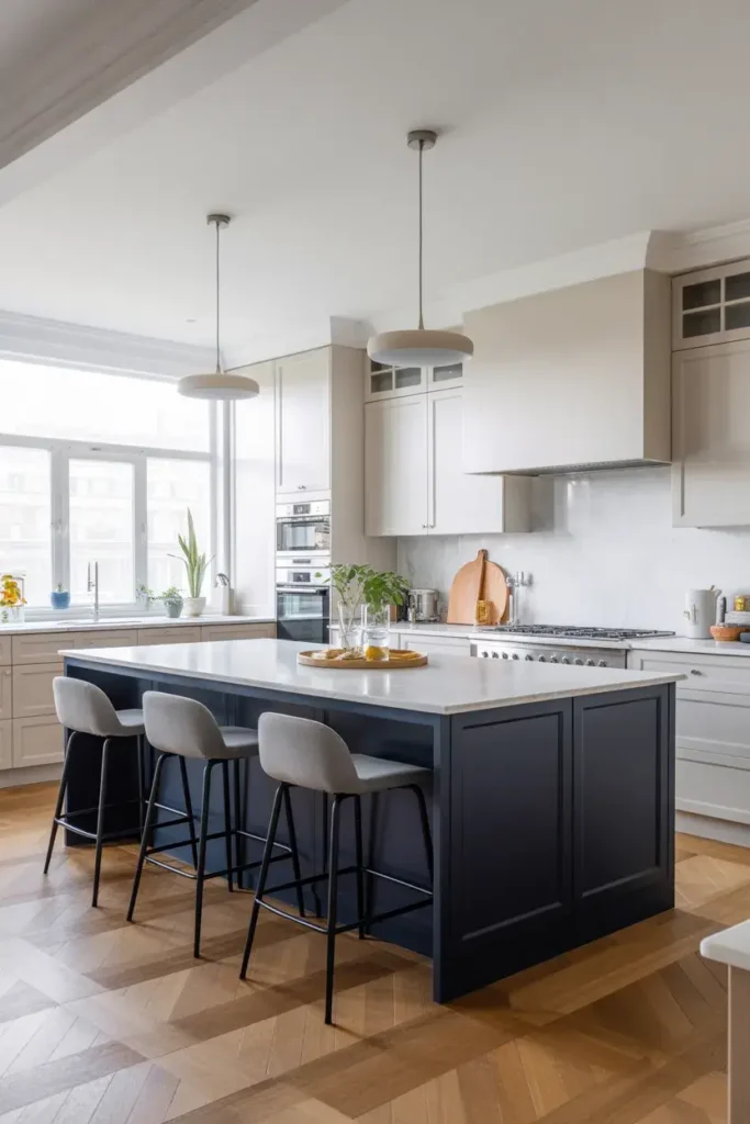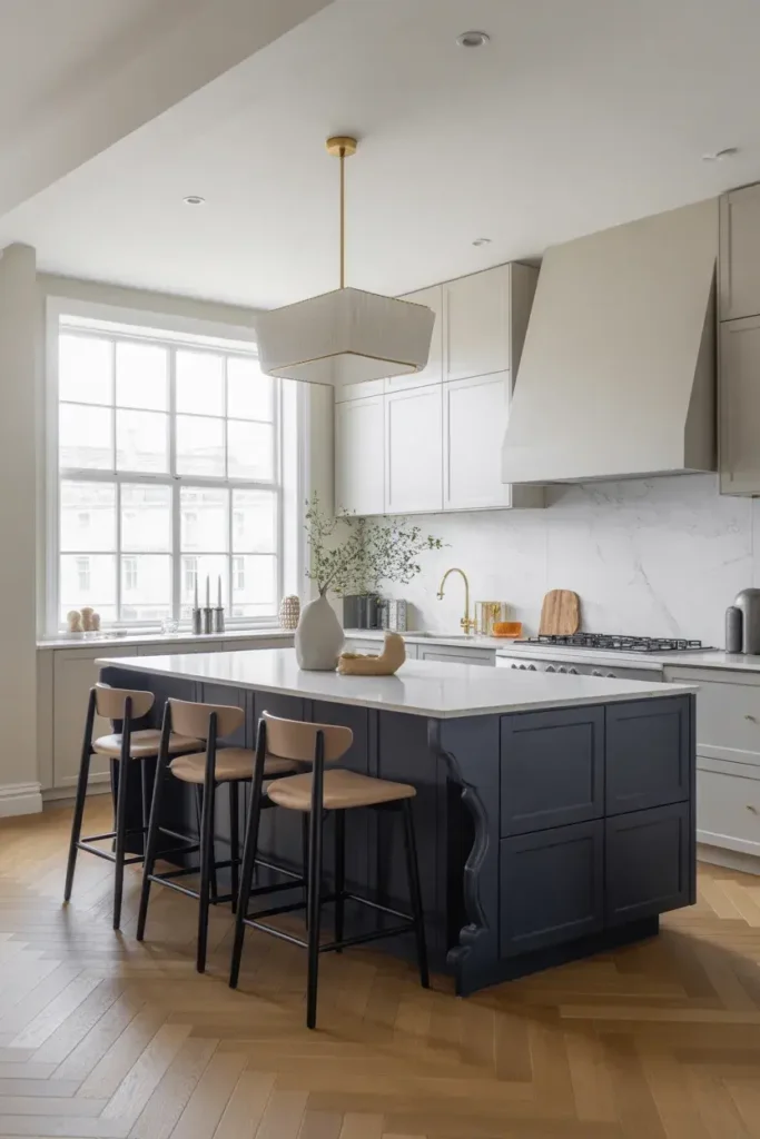 A navy island becomes a bold focal point while the rest of the kitchen stays neutral.