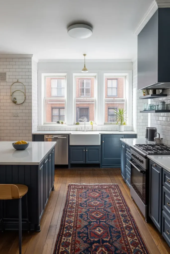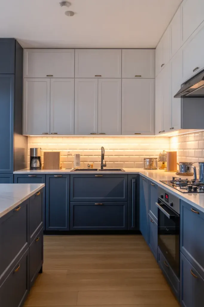 Mixing navy with lighter tones keeps the kitchen visually balanced.