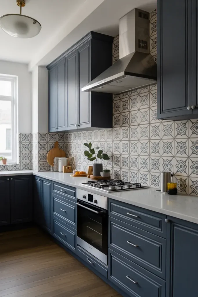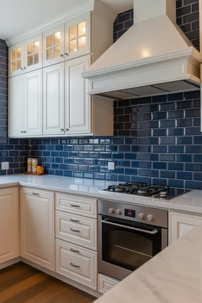 If you want navy but not a full kitchen makeover, start with the backsplash.