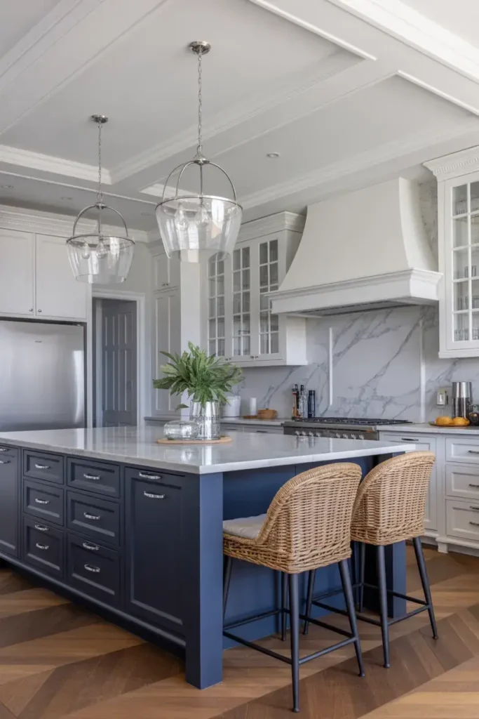The mix of navy cabinets and glass lighting creates a kitchen that feels both modern and timeless.