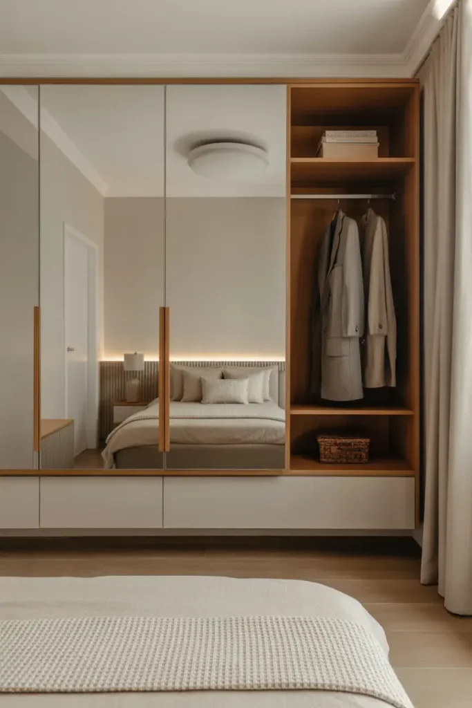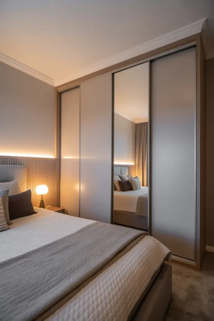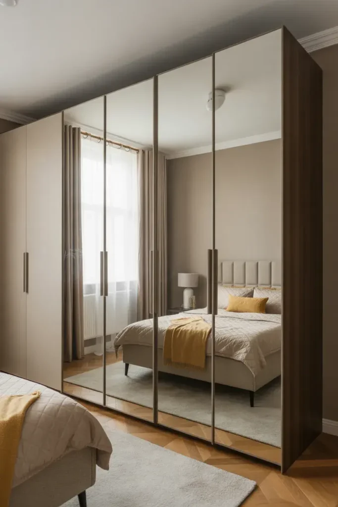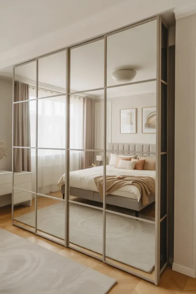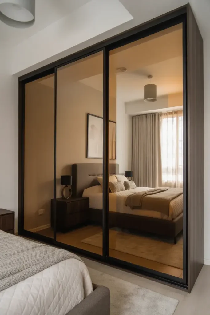 Sliding mirror panels combine style and practicality. They reflect light while maintaining sleek functionality.