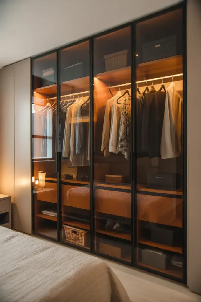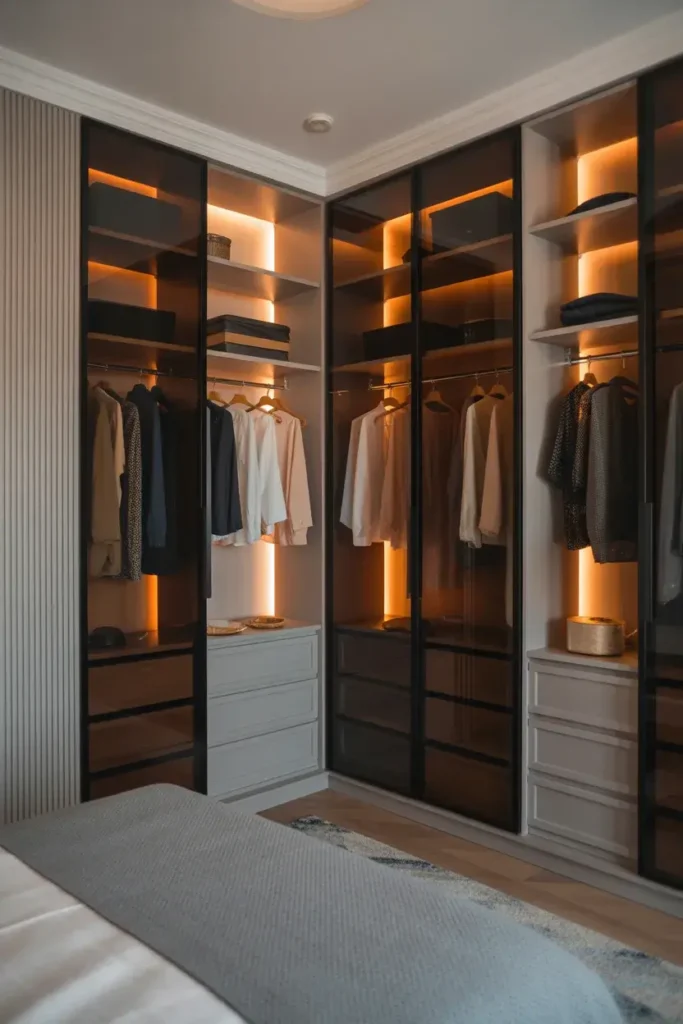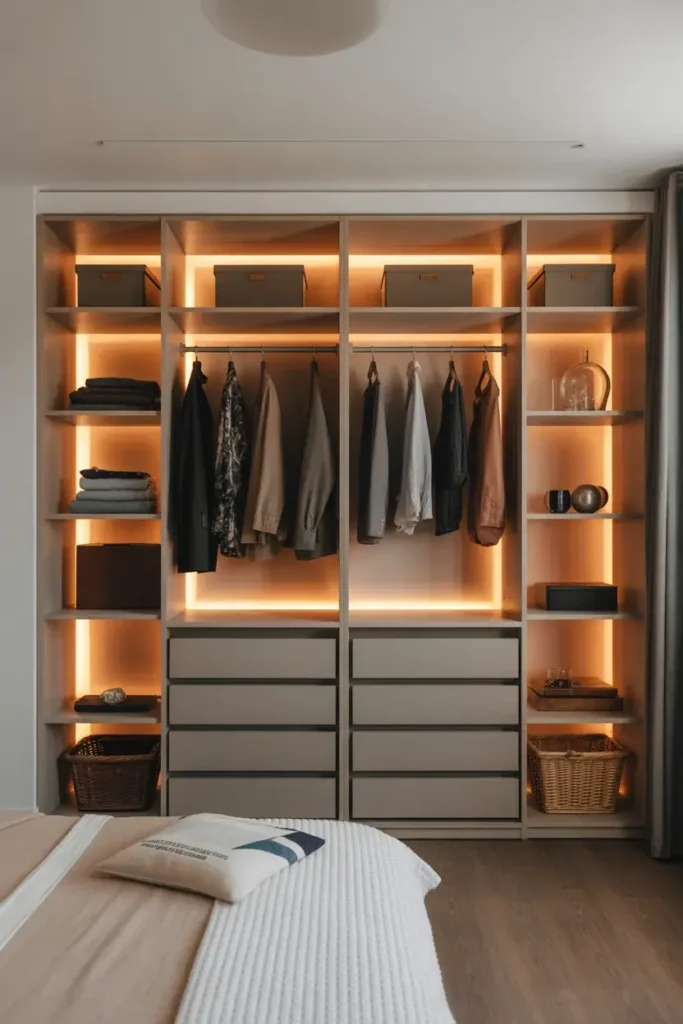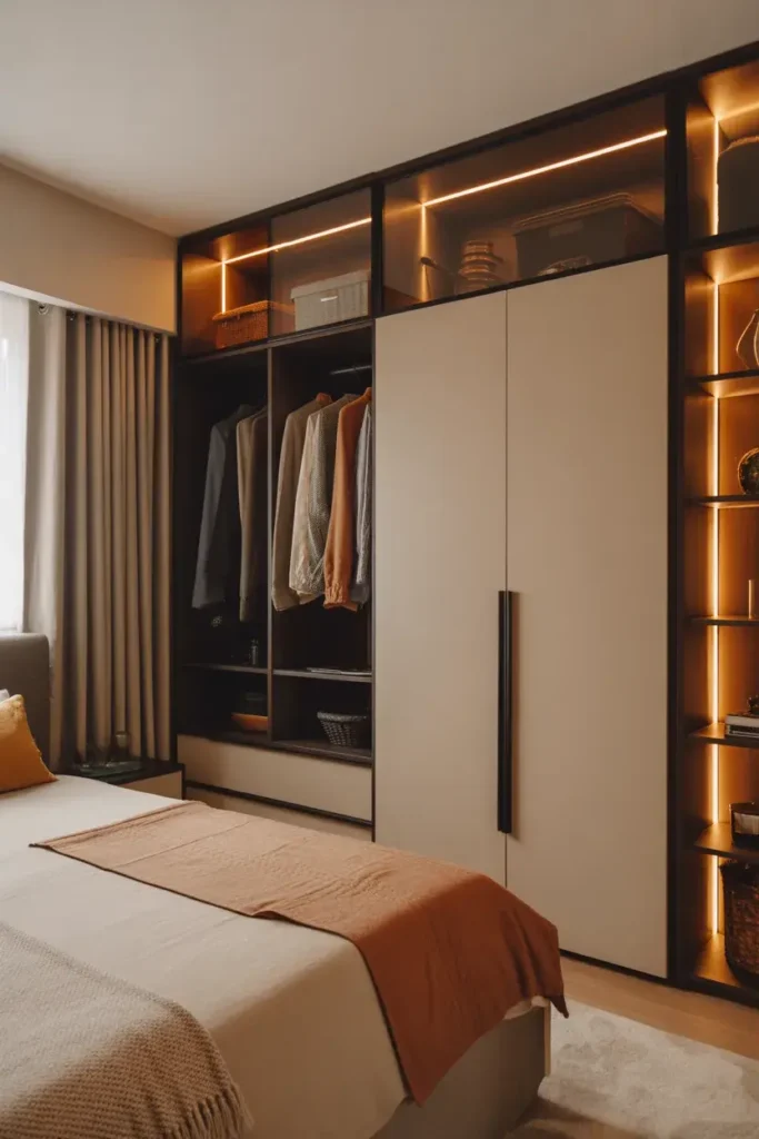 Soft interior lighting can make a wardrobe feel surprisingly luxurious. When the doors open and a gentle glow lights up the shelves and hanging sections, the entire space feels more organized and elegant.